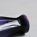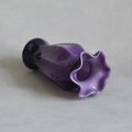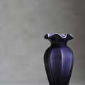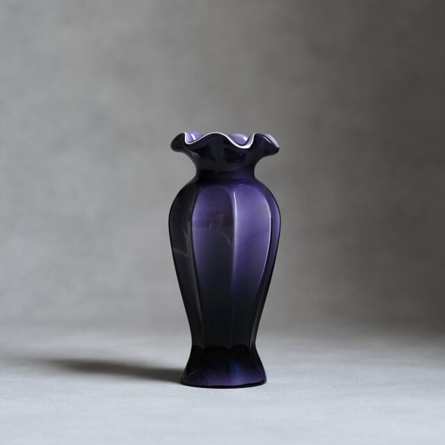 1940年代後半から1960年代頃に製造されたFenton社製の貴重なヴィンテージフラワーベース。一見すると吸い込まれるような深い漆黒のように見えますが、光を照らすと鮮やかなアメジストカラーが美しく浮かび上がる、当時のアメリカのガラス工芸ならではの贅沢な色使いが特徴です。分厚いガラスでずっしりと重厚感があるので花器としてはもちろん、インテリアのオブジェとしても。