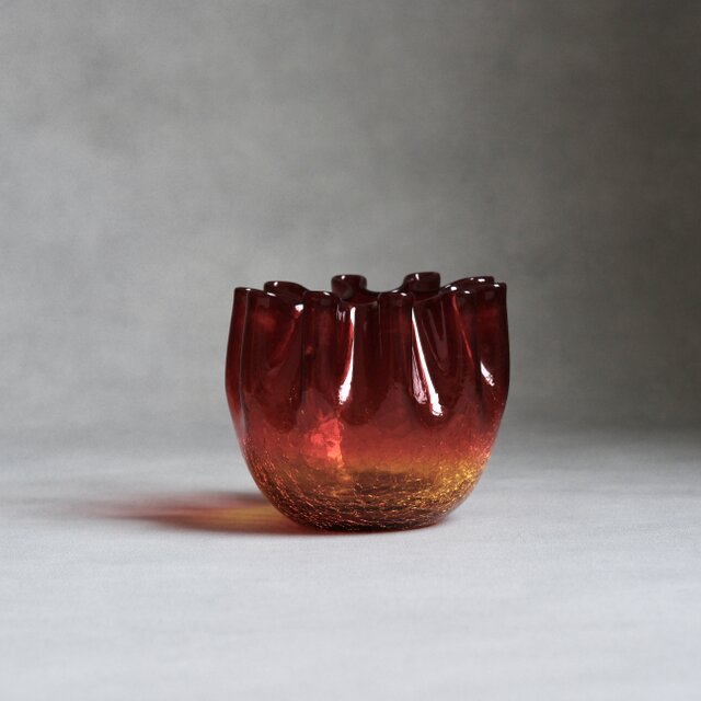 表面には「クラックル」と呼ばれる伝統的な技法が施されており、細かく入ったひび割れのような模様が光を複雑に反射し、まるで内側から発光しているかのような輝きを放ちます。また、縁を波打たせた「ハンカチーフ・エッジ」と呼ばれる有機的なフォルムは、当時のモダンデザインの粋を集めた造形美を感じさせてくれます。