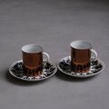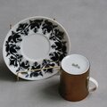 1970年代にドイツの名窯、Rosenthal社で制作されたデミタスカップ&ソーサーの2セット。カップに施された斬新なコッパー(銅)のメタリックコーティングと、ソーサーを彩るクラシカルな黒のボタニカルパターンのコントラストが個性的でありながら、どこか上品な雰囲気のデザインです。デミタスカップ(通常のコーヒーカップの約半分のサイズ)なので、見た目も可愛らしい佇まいです。上質なコーヒーと共に贅沢なひと時を過ごせそうな1点です。
