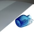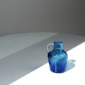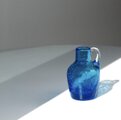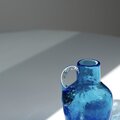 アメリカ・ウェストバージニア州の伝説的なガラスメーカー、Pilgrim Glass(ピルグリム・グラス)社によって、1950年代から60年代にかけて製作された小さなガラス花瓶。透き通るような鮮やかなコバルトブルーと、氷が砕けたような幻想的なテクスチャが美しい1点です。「クラックル(ひび割れ)」模様は、高温で吹かれた直後のガラスを瞬時に冷水に浸し、表面に無数の亀裂を入れた後、再び加熱して滑らかに焼き固めるという非常に高度な職人技によって生み出されています。光を透過させると、その網目状の装飾が複雑に反射し、まるで水面のような煌めきもたらします。また、職人の手仕事によって成形された小ぶりなハンドルと、ぽってりとした温かみのあるフォルムが、現代の既製品にはないヴィンテージ特有の深い味わいを感じさせてくれます。一輪挿しとしてはもちろん、オブジェとして飾るだけでも絵になる佇まいです。背の高い花器で役目を終えた花を、茎を整えて移し替えるセカンドベースとしても重宝します。