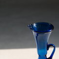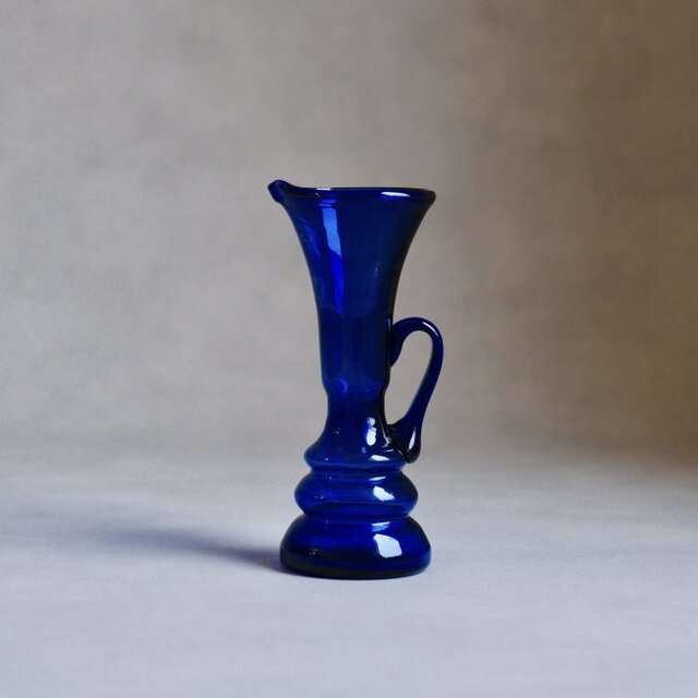 深いブルーが印象的なヴィンテージガラスの花瓶。すっと立ち上がる縦のラインと、ややフレアした口元、側面に添えられた小さなハンドルが、クラシカルでありながらどこか愛らしい佇まいです。ガラスにしっかりとした厚みがあり、色ガラスならではの奥行きのある発色も魅力。花を一輪すっと挿すだけで絵になり、何も活けずにオブジェとして飾っても空間のアクセントになります。