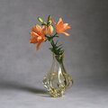 厚みのあるクリスタルガラスに、淡いイエローの色ガラスを重ね、ガラスをねじるように成形された有機的なフォルムが印象的な一品です。光を受けることで生まれる柔らかな陰影と、手仕事ならではの揺らぎが、空間に静かな存在感を与えてくれます。口元はわずかに歪みを残した仕上げで、一輪挿しとしてはもちろん、オブジェとして飾っても美しい佇まい。花を活けない時間も、インテリアのアクセントとしてお楽しみいただけます。