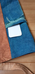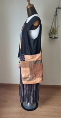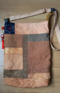 自分で染めた藍染布をメインに作りました。高さが38㎝で縦長バックになりました。長年染めてきた帯芯を使いました。内袋は藍染の作務衣だったものをほどいて使いました。