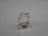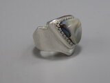 リングのサイズは14号、重さは17g、最大幅は25mm、手のひら側の幅は9mm、金属部分は純銀です。