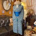 このワンピースは、深く穏やかな青緑色の着物地に、草花が絡み合うような総柄が描かれた、極めて優雅で情緒的な逸品です。その柄行きは、まるで英国の古い屋敷の壁紙や秘密の庭園を思わせるロマンティックな美しさを持ちながら、日本の伝統的な「渋さ」と「繊細さ」が融合しています。