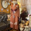 このリメイクドレスは、準礼装の着物である「付け下げ」を贅沢に使用しています。地色は、柔らかな薄いグレージュ(またはアイボリー系の薄色)で、着物ならではの優美な柄付けと金彩の煌めきを最大限に際立たせています。その姿は、淑やかで落ち着いた大人の女性にふさわしい、格調高い一着です。
