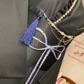 この帯飾りは、夜空や深海を思わせる深い藍色が特徴のソーダライトと、気品あふれるパールビーズを連ねた、神秘的なデザインです。ソーダライトは、知性や直感力を高め、理性的な行動を促す「叡智の石」と言われており、その深い青が、装い全体に落ち着きと高貴な雰囲気をもたらします。