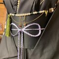 この帯飾りは、深い緑色に独特な縞模様を持つマラカイトと、気品あふれるパールビーズの個性的でエキゾチックなデザインです。マラカイトは、強力な邪気払いの力を持つ「魔除けの石」として古くから珍重されており、その鮮烈な緑が、装い全体に生命力と高貴なオーラをもたらします。
