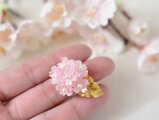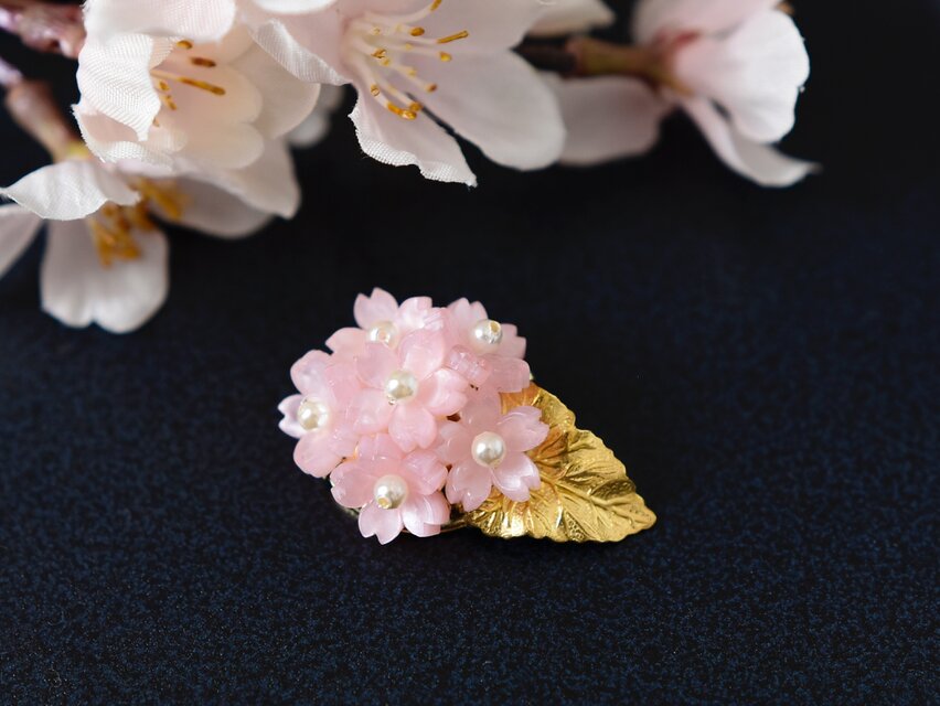 春限定【ブローチ】薄ピンクとパールの桜の花束/真鍮の葉っぱ付(春爛漫)
