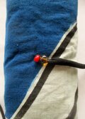 中綿を入れ、黒の着物で作ったループをつけ、ループの先に、トンボ玉と山サンゴを付けています。