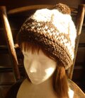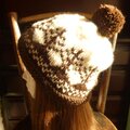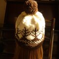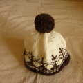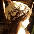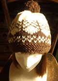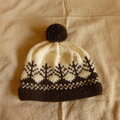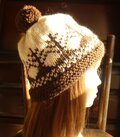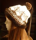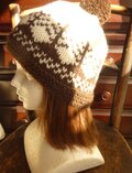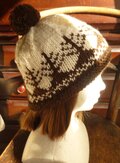 生成り色の糸に焦げ茶色でツリー柄を編み込んだ帽子です。