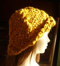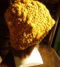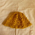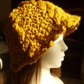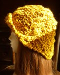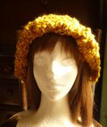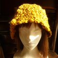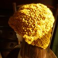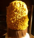 黄色の節のある糸で編んだなわ編みの帽子です。