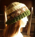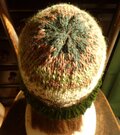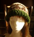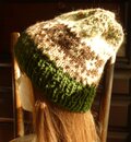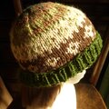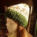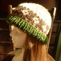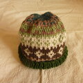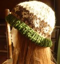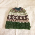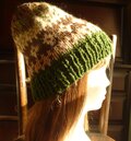 グリーンを基調に茶系の糸で柄を編み込んだ帽子です。