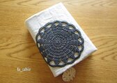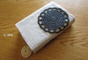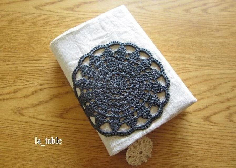 リネン地にシルクヤーンで編んだ花のモチーフを大小2つ、