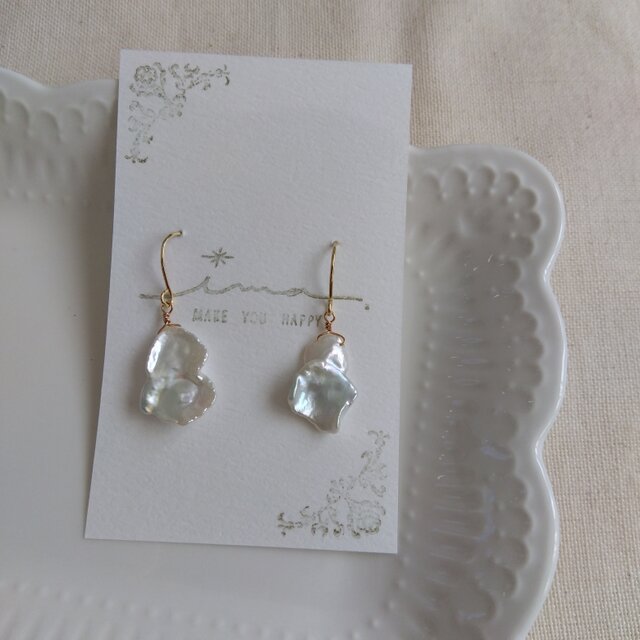 14kgf いびつな形が美しい大きな淡水ケシパールのピアス