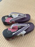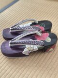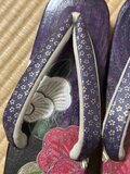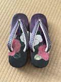 • 上品な鼻緒: 革です。紫色の鼻緒には、金色の繊細な小花柄があしらわれ、全体のデザインを一層引き立てています。