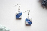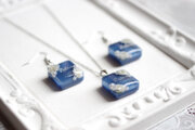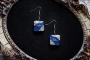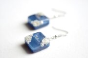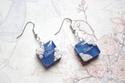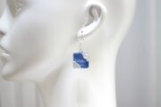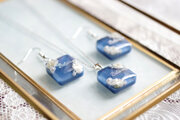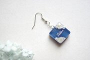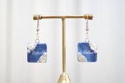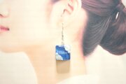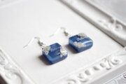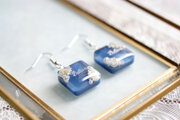 こっくりしたブルーの背景にお花やパールを配置し、中央に文字を置いたデザインが静謐で上品なピアス。(中央の文字は予告なく変更されることがあります)