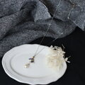 白ベースの装いに映えるメタリックなブラックビーズ。