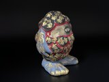 ⑥張り子の底に穴を開け胡粉液(胡粉とにかわを混ぜたもの)を注入して重しにします。