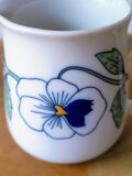 純白の磁器の側面に、ブルーとグリーンの淡い色調でパンジー(三色スミレ)のモチーフが描かれています。水彩画のような繊細なタッチは、置くだけでテーブルに静かな華やぎをもたらします。