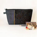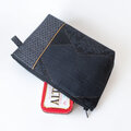 大島や他正絹紬・絣などを切り替えてオシャレに細いラインで締めました手作りポーチです。柄物の生地は表側で良い柄が出るようにしておりますので反対面は成り行きです。内袋は和柄の木綿地や胴裏・八掛などを使っています。細いラインは白大島を手染めでムラ染めにしたものをバイアステープに仕立てております。金茶ライン・赤ラインは正絹八掛をバイアスにしております。