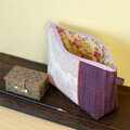 大島や他正絹紬・絣などを切り替えてオシャレに細いラインで締めました手作りポーチです。柄物の生地は表側で良い柄が出るようにしておりますので反対面は成り行きです。内袋は和柄の木綿地や胴裏・八掛などを使っています。細いラインは白大島を手染めでムラ染めにしたものをバイアステープに仕立てております。金茶ライン・赤ラインは正絹八掛をバイアスにしております。