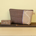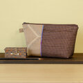 Y-203大島紬切り替えポーチ/白茶紬×青紫ラインこげ茶色大島