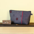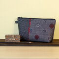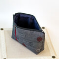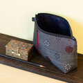 大島や他正絹紬・絣などを切り替えてオシャレに細いラインで締めました手作りポーチです。柄物の生地は表側で良い柄が出るようにしておりますので反対面は成り行きです。内袋は和柄の木綿地や胴裏・八掛などを使っています。細いラインは白大島を手染めでムラ染めにしたものをバイアステープに仕立てております。金茶ライン・赤ラインは正絹八掛をバイアスにしております。