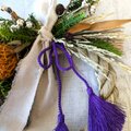 紫色のタッセル付きヒモを結んで、お正月らしく華やかな印象に仕上げました。