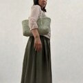 お客様から「大きめのバッグが欲しい」というご要望がありましたので、今回はゆったりとした大きめサイズでお作りしました。持ち手の長さは、ショルダーバッグとしてもハンドバッグとしてもお使いいただける長さです。
