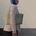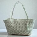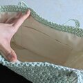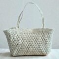内側にはポケットがついており、開口部分も小さな花結び編みで仕上げています。バッグ全体は柔らかく、体にやさしくなじむのが特長です。持ち手も細かく編み込んであるため、上品でレースのような印象を与えます。