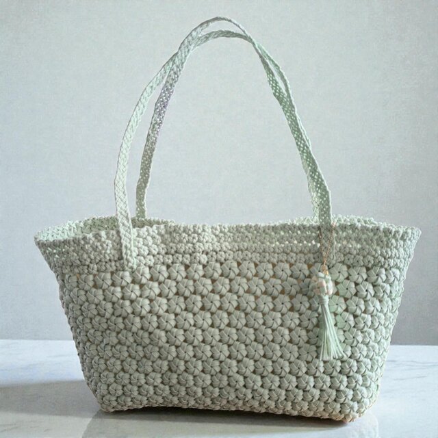 チャームが付いた爽やかなミントグリーンのクラフトバンド花結びショルダーバッグ ハンドバッグ ギフト ホワイトデー 新生活 通勤