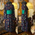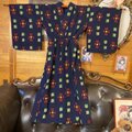 【 和洋折衷セミロングワンピース 着物アンサンブル 帯サッシュベルト付き ハンドメイド レトロ 古着 濃紺・カラフル絣紋 aKW-119 】
