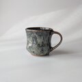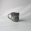 深い緑がかった釉薬に、窯の中で生まれた自然な流れ模様が広がる、手仕事のマグカップです。