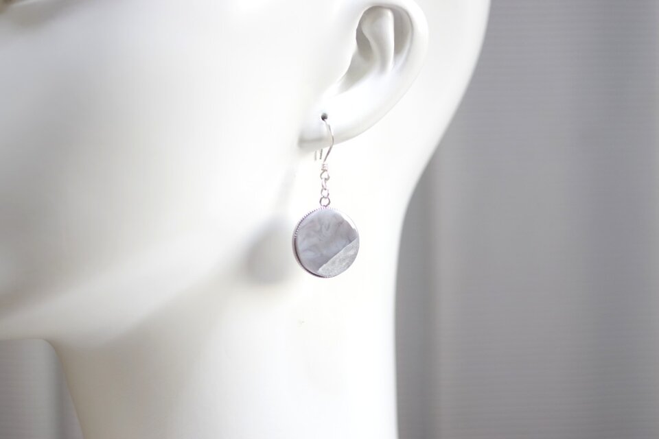 グレーとホワイトが美しいマーブル模様を描くレジンに、シルバーの装飾を施したピアス。