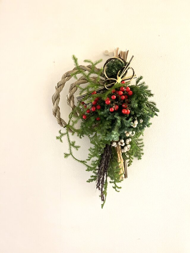 花材の姿形が際立つシンプルなしめ縄飾りです。