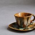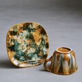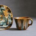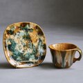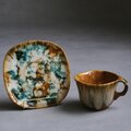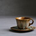 カナダを代表する陶磁器メーカー、Céramique de Beauce(ボースウェア)社製のヴィンテージカップ&ソーサー。1960年代から70年代にかけて作られたこのシリーズは、北欧デザインの影響を受けたモダンなフォルムと、職人の手仕事を感じさせる複雑な釉薬の表情が魅力。温かみのあるキャメルをベースにグリーンやホワイトが混ざり合う「ドリップグレイズ(流し釉)」が美しい1点です。ひとつひとつ色の混ざり方が異なるため、世界にふたつとない一点物としての趣を楽しめます。ぽってりとした厚みのある質感は手に馴染みやすく、手に持った際にちょうど口元にはカップの角があたるようにデザインされています。そんな作り手のちょっとした工夫が、日々のコーヒータイムに心地よい温もりを添えてくれます。