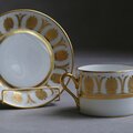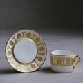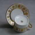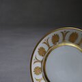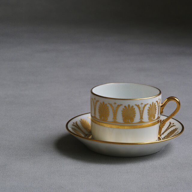 ナポレオン時代のアンピール様式を思わせる、金彩のパルメット(聖なる植物)紋様が白磁に美しく映えます。現代の品にはない、当時の職人仕事による厚みのある金彩の輝きが、テーブルに格別な気品を添えてくれます。