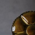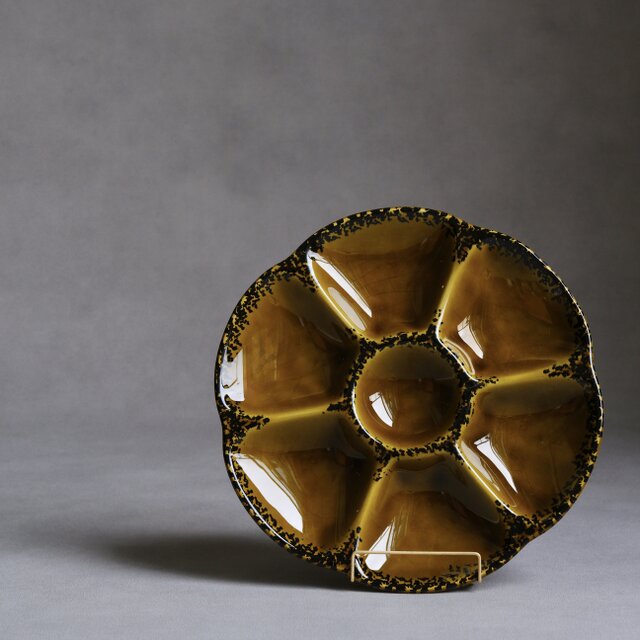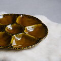 こちらは当時オイスタープレートとして作られた物で、真ん中の凹みはレモンスライス用のスペースとして使われていたそうです。艶があり、深みのあるオリーブカラーが特徴的です。7つの仕切りを利用してアクセサリートレイやパーティーに、様々な用途に使えそうです。
