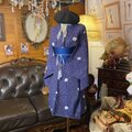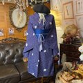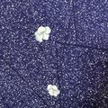 このワンピースは、深く落ち着いた藍色(インディゴブルー)に近い紫の着物地に、無数の白いドットと可憐な白の小花が散りばめられた、極めて幻想的で詩的な逸品です。その柄行きは、まるで冬の夜空に舞う雪や、星の瞬きのように、静謐な美しさと深い物語性を放っています。