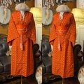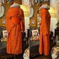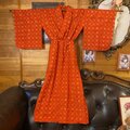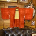 深みのある朱色(オレンジがかった赤)に、細やかな小紋柄が全体に施された、大変美しいアンサンブル着物をリメイクしました。温かみとレトロ感があり、着物ならではの独特な柄の繋がりと光沢が楽しめます。