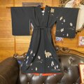 【 付け下げ着物リメイク ワンピース ドレス 洗える 化繊 名古屋帯サッシュベルト 和洋折衷 レトロ 古着 ハンドメイド 漆黒に浮かぶ雅な絵巻 KW-1186】