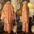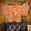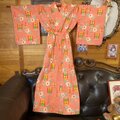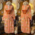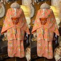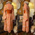 【 和洋折衷 ロング ワンピース 着物アンサンブル 名古屋帯サッシュベルト付き ハンドメイド レトロ 古着 オレンジピンク・ポップな花柄 aKW-126 】