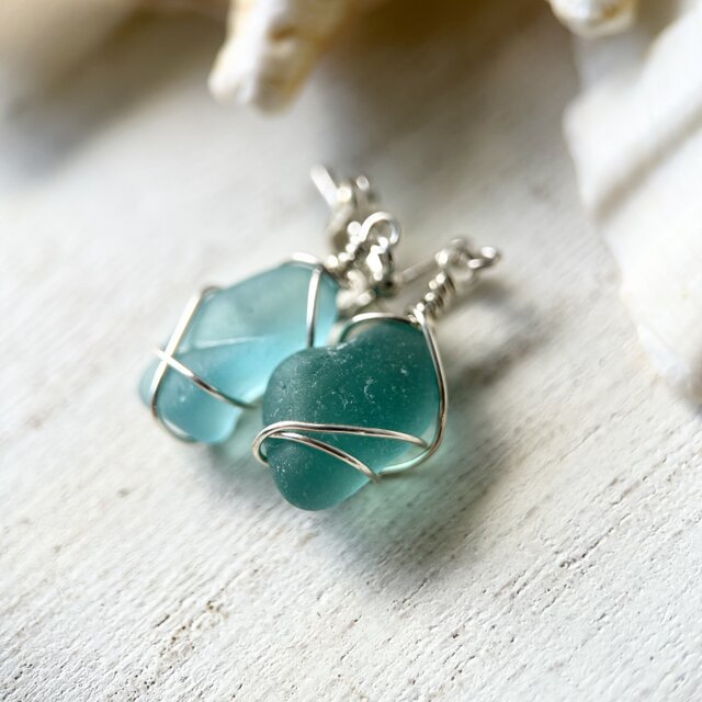 《スターリングシルバー/Silver925》海色シーグラスの揺れるスタッズピアス―小さな海をいつでもそばに―