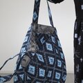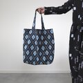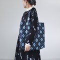 古い備後絣の反物から作ったトートバッグです。黒に近い濃藍色の地に絣柄。しっかりしていてハリのある生地です。持ち手は肩掛けできる長さで裏地には紬の生地を使用しました。芯や金具は使用していません。内ポケット付き。