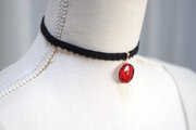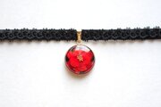 椿が一輪咲いたような鮮やかで存在感のあるレジンを、ベルベットリボンにタティングレースで装飾を施したチョーカーに仕上げました。