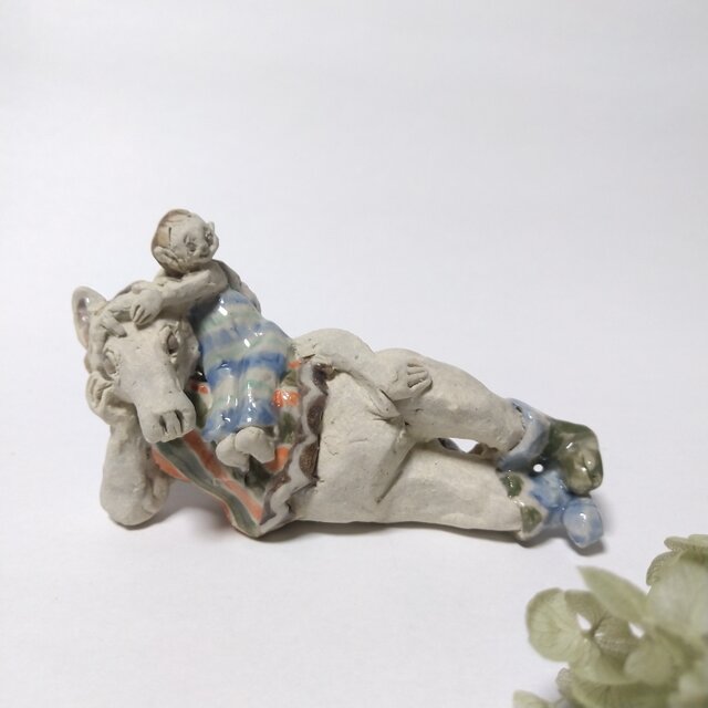 2026年の干支でもあるごろりと寝転んだ午(馬)さんに、ちびっこ天使が座っています。
