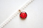 椿が一輪咲いたような鮮やかで存在感のあるレジンを、サテンリボンにタティングレースで装飾を施したチョーカーに仕上げました。