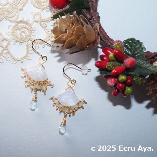 #Ecru #天然石 #イヤリング #ピアス #Noel #Christmas #レインボームーンストーン #プレシャスオパール #アクアマリン #ブルーカルセドニー #ファンカット #Ecru_Noel #Ecru_新作