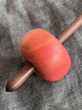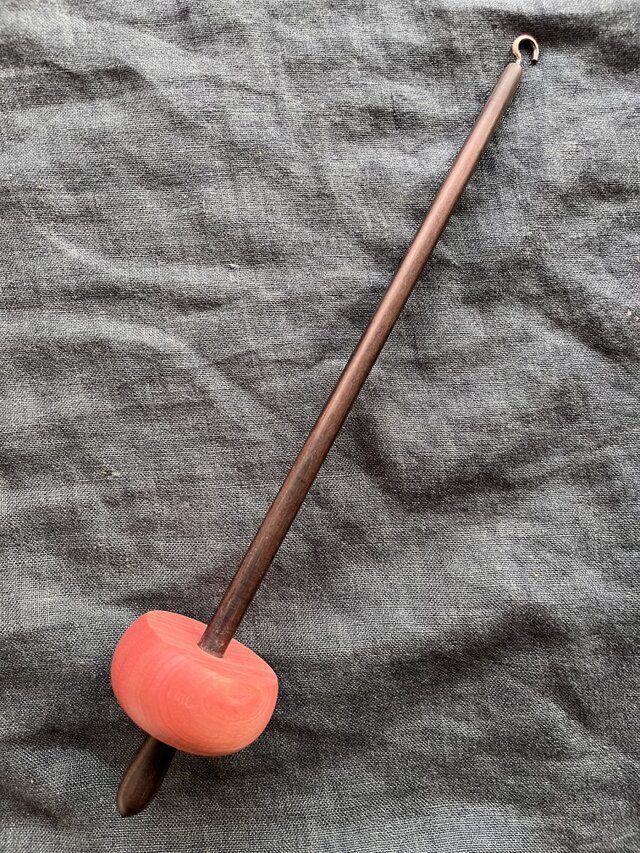 ドロップスピンドルとして吊るして紡ぐこともできますが、落下の衝撃でバランスが乱れたり先端が潰れたりしてブレが生じることもございますので、サポートスピンドルとして受け皿等の上に置いて紡ぐことを推奨いたします。